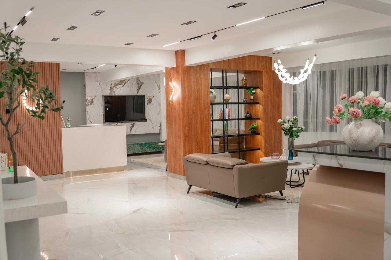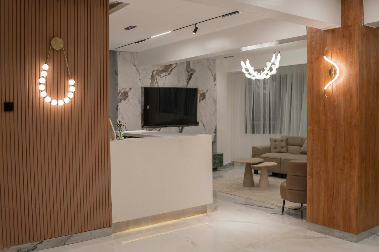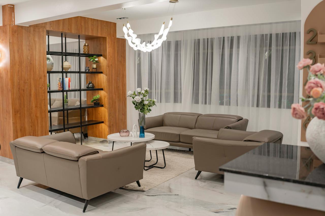 This lounge revamp creates a modern, welcoming space with luxury finishes ideal for hospitality and office interiors in Africa. The marble and wood reception desk adds elegance, while premium leather seating brings warmth and comfort—perfect for hotel lobbies, corporate spaces, and high-end African interior design projects
